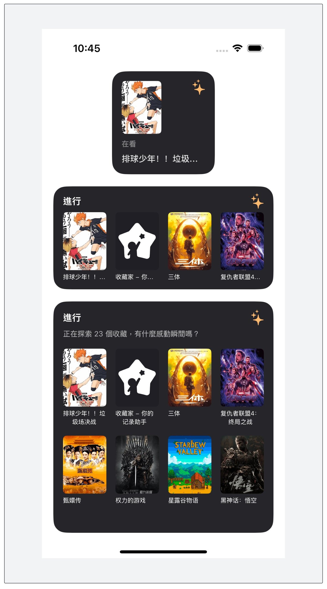 用於快速打開 App,處於主屏幕時將同步具備搜索收藏的功能,組件時不時會選取收藏封面作爲背景